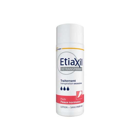 Etiaxil Détranspirant Pieds Peaux Normales 100ml é uma loção anti-transpirante que ajuda a parar a transpiração excessiva dos pés. Contendo uma elevada concentração de ingredientes activos anti-transpirantes, esta loção anti-umidade e anti-odor ajuda a descansar as glândulas sudoríparas, que deixam de produzir suor durante alguns dias. Sem perfume, é compatível com a utilização diária de um desodorizante ou de um perfume e está indicada para peles normais.