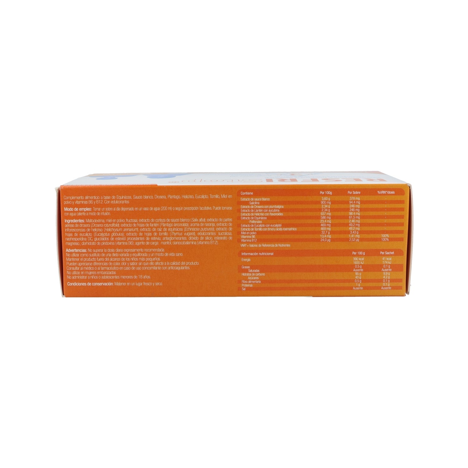 Suplemento alimentar que apoia o sistema imunitário contra os radicais livres. Contém helichrysum, que possui propriedades anti-histamínicas e expectorantes. Inclui também plantago lanceolata, que ajuda a acalmar a garganta e a faringe. Drosera rotundifolia, que actua como supressor da tosse e mucolítico. A equinácea (Echinacea purpurea) contribui para aumentar as defesas. O tomilho e o eucalipto são expectorantes e descongestionantes. O mel tem um efeito calmante e energizante. As vitaminas B6 e B12 apoiam o funcionamento normal do sistema imunitário, reduzem o cansaço e a fadiga.