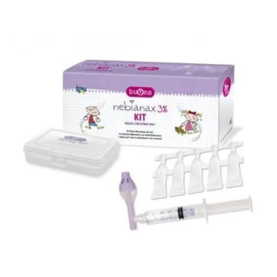 Buona Nevianax 3% Kit 20 Viais x 5ml + Spray é um conjunto infantil para descongestionar e limpar a cavidade nasal, possui solução hipertônica a 3% com ácido hialurônico e dispositivo nebulizador para facilitar e melhorar a aplicação em crianças.