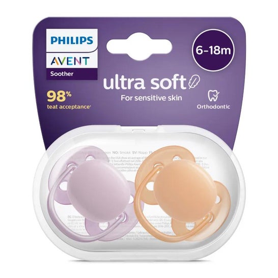 Conjunto de duas chupetas com tetina de silicone anatómica e orifícios de ventilação. Ajuda a satisfazer o instinto natural de sucção do bebé, respeitando o crescimento natural dos dentes e das gengivas. Adequado para bebés entre os 6 e 18 meses. *A cor e o design do produto podem variar dependendo da disponibilidade.