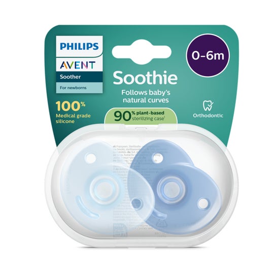 Philips Avent Soothie Chupeta Eco Azul 0-6M Scf099/21 2uds é um produto projetado para bebês de 0 a 6 meses. Esta chupeta é fabricada em uma única peça com 100% de silicone de grau médico, o que a torna segura para as pequenas bocas.