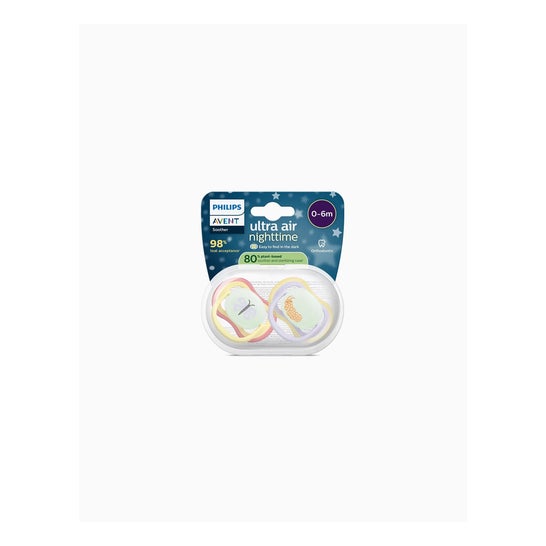 Philips Avent Ultra Air Nighttime Mariposa Gusano 0-6M 2uds é um pacote que inclui dois chupetas projetadas para bebês de 0 a 6 meses. Esses chupetas contam com amplos orifícios de ventilação que permitem que a pele do bebê respire, mantendo-a suave e seca. Sua carcaça é leve e apresenta bordas arredondadas, garantindo um conforto ótimo ao estar em contato com a pele do pequeno.
