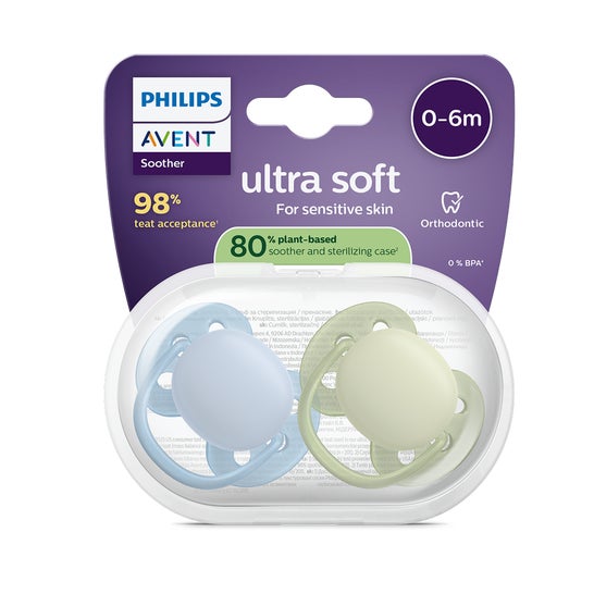 Philips Avent Ultra Soft Chupete Eco 0-6M Verde Azul 2uds é um produto projetado especialmente para bebês com pele delicada. Este chupete se caracteriza por seu escudo flexível e suave, que ajuda a diminuir notavelmente o risco de irritações e marcas no rosto, oferecendo um conforto ótimo.
