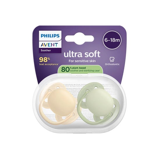 Philips Avent Ultra Soft Chupete Eco 6-18M Beig Green 2uds é um produto projetado especificamente para bebês com pele sensível. Este chupete conta com um escudo flexível e suave, o que reduz notavelmente o risco de irritações e marcas na pele do rosto, garantindo assim o máximo conforto para o pequeno. É adequado para bebês de entre 6 e 18 meses, combinando cuidados dermatológicos, apoio ao desenvolvimento oral e um enfoque na sustentabilidade.