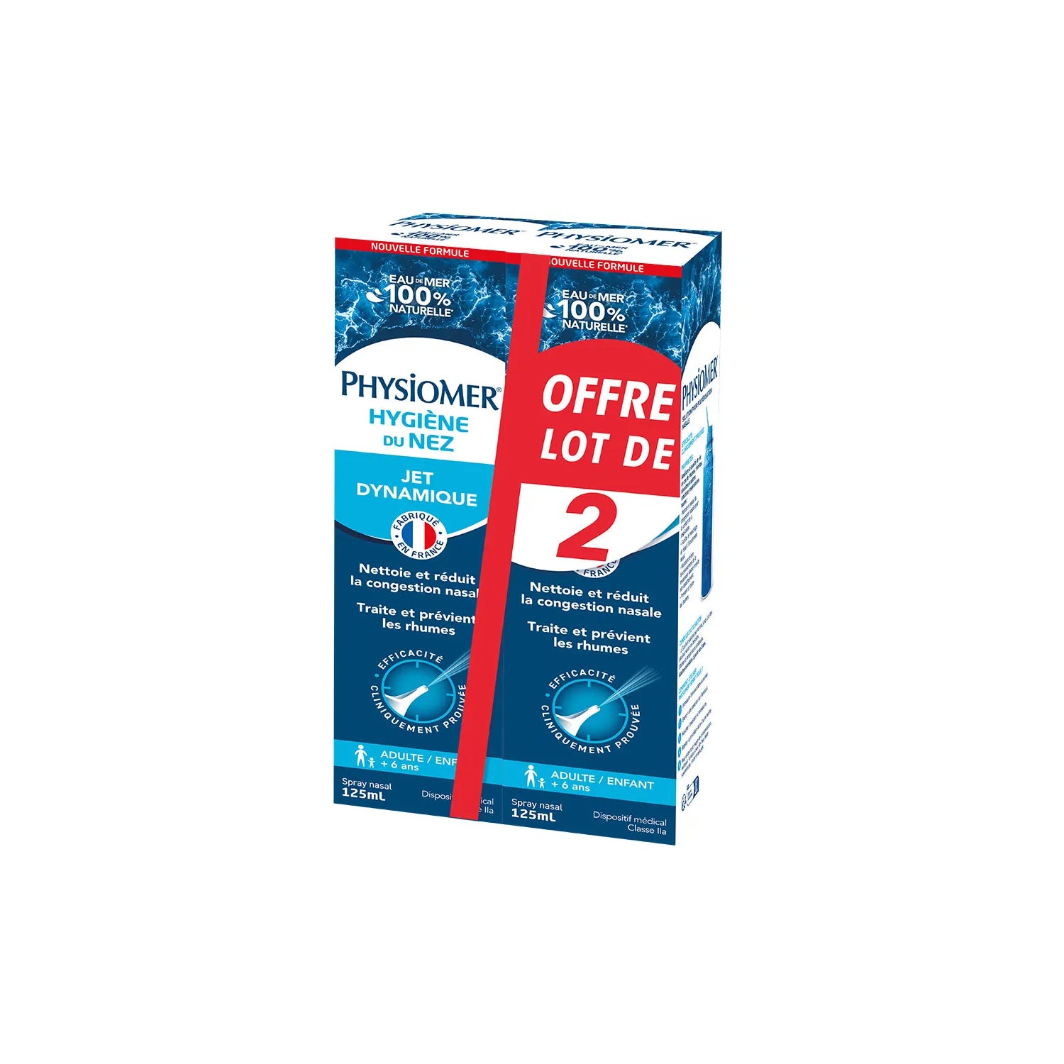 Physiomer Higiene do Nariz Jato Dinâmico 2x125 ml é uma solução formulada à base de água do mar natural para limpar, hidratar e aliviar a congestão nasal (resfriados, rinite, etc.). Sua fórmula contém numerosos minerais e oligoelementos que ajudam a limpar as fossas nasais, favorecem a eliminação da mucosidade, ao mesmo tempo que hidratam a mucosa nasal e ajudam a protegê-la contra infecções. 100% água do mar natural. Estéril. Este produto é adequado para adultos e crianças a partir de 6 anos.