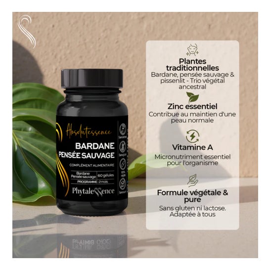 Phytalessence Absolutessence Bardana Pensamento Selvagem 60 Pérolas é um complemento alimentar à base de bardana e pensamento selvagem. Esta fórmula associa três plantas purificantes tradicionais: