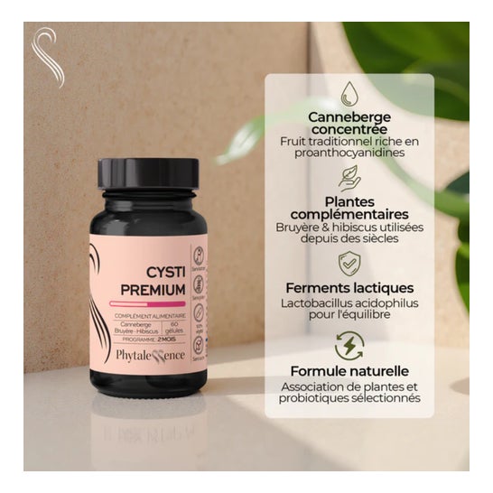 Phytalessence Cysti Premium 60 Pérolas é um complemento alimentar rico em extratos de Mirtilo, Hibisco e Urze, projetado para prevenir infecções urinárias.