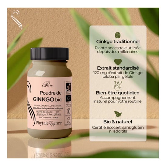 Phytalessence Ginkgo Bio 60 Pérolas é um complemento alimentar à base de extrato de ginkgo biloba.