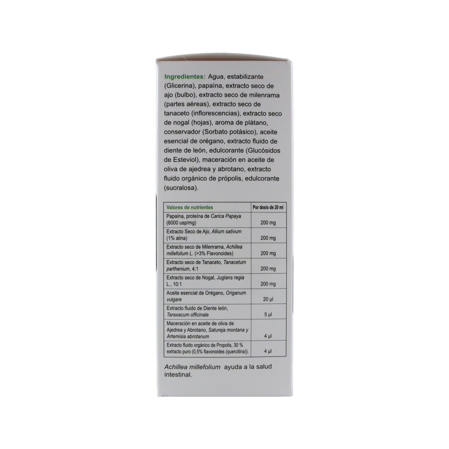 É um suplemento nutricional que ajuda a eliminar os parasitas intestinais. Elaborado com papaína, uma proteína vegetal com enzimas digestivas. Com extrato seco de alho, extrato seco de yarrow, extrato de tansy, extrato seco de noz. Contém óleo essencial de orégãos com propriedades antiparasitárias, azeite de segurelha, giesta, satureja montana e artemísia. Com ingredientes anti-helmínticos e extrato fluido de própolis verde. Indicado para crianças a partir dos 6 anos de idade.
