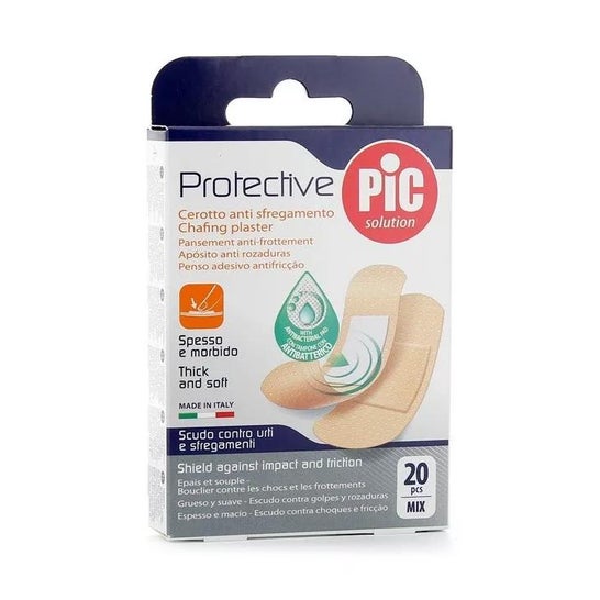 PiC Protective com curativo adesivo bactericida ajuda a proteger as feridas, bem como a proteger e evitar golpes e fricções, graças à sua espessura. Estes são pensos adesivos protectores antibacterianos com suporte de polietileno expandido.