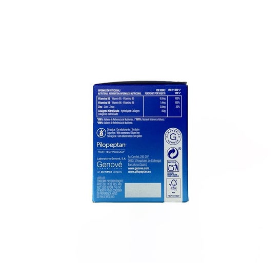 Suplemento alimentar em formato de saqueta bebível que ajuda a prevenir a queda excessiva de cabelo. Ajuda também a melhorar o aspeto das unhas e a suavizar a fibra capilar. Formulado com colagénio hidrolisado, vitaminas B5, B6 e zinco. Favorece igualmente o reforço e a fixação do cabelo ao folículo piloso e facilita a formação de queratina.