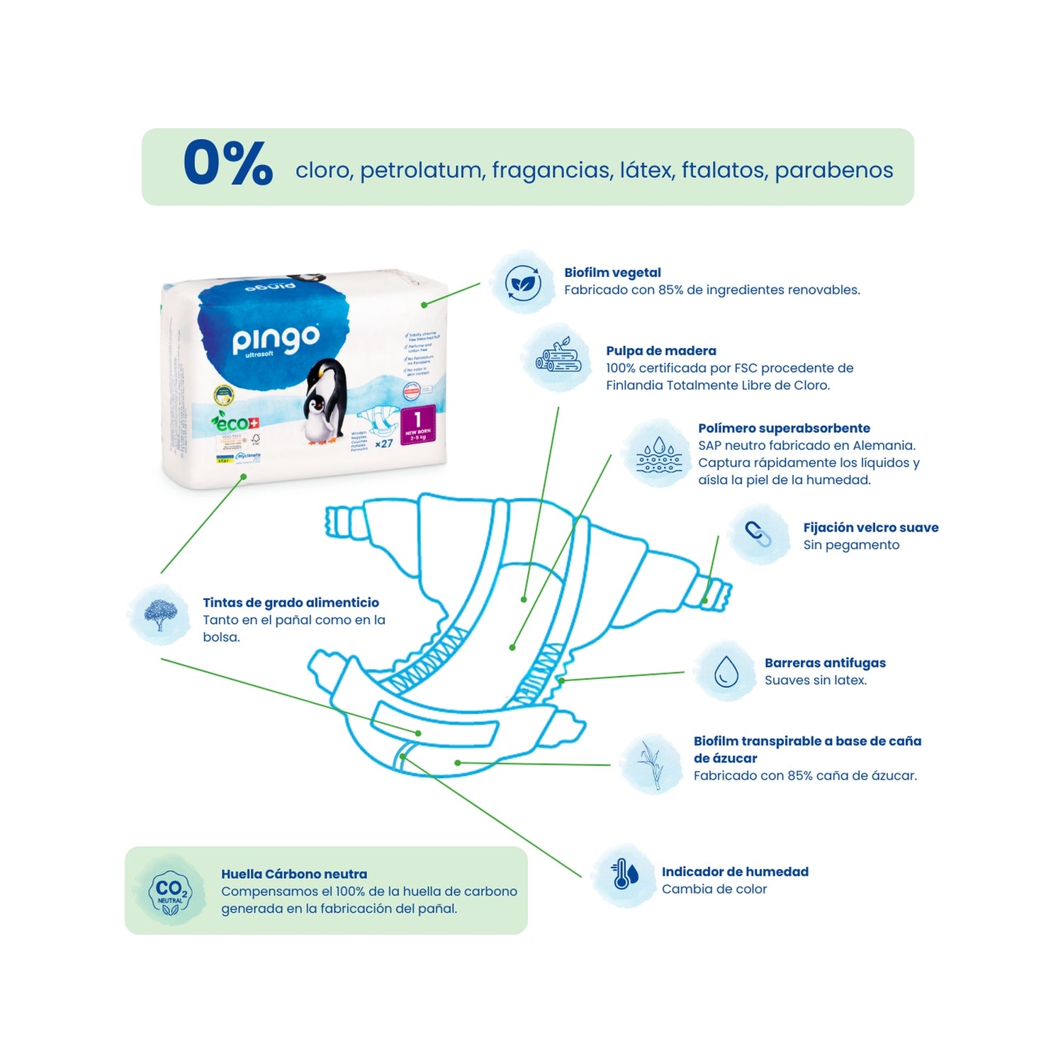 Pingo Pingo Fraldas Biológicas T1 Recém-Nascido 27pcs é um conjunto de fraldas orgânicas que ajudam a manter a pele do bebé seca e confortável, concebido com um núcleo absorvente que mantém a pele do bebé seca dia e noite e é adaptável, ajustando-se à morfologia do bebé e permitindo liberdade de movimentos. Além disso, possui barreiras anti-fugas, é suave para a pele delicada do recém-nascido e possui um indicador de humidade com mudança de cor para garantir o conforto do bebé. Adequado para recém-nascidos ou bebés de 2 a 5 kg.Certificação Oeko-Tex Standard de todos os ingredientes, garantindo a ausência de substâncias nocivas. Fabrico sustentável e materiais amigos do ambiente.
