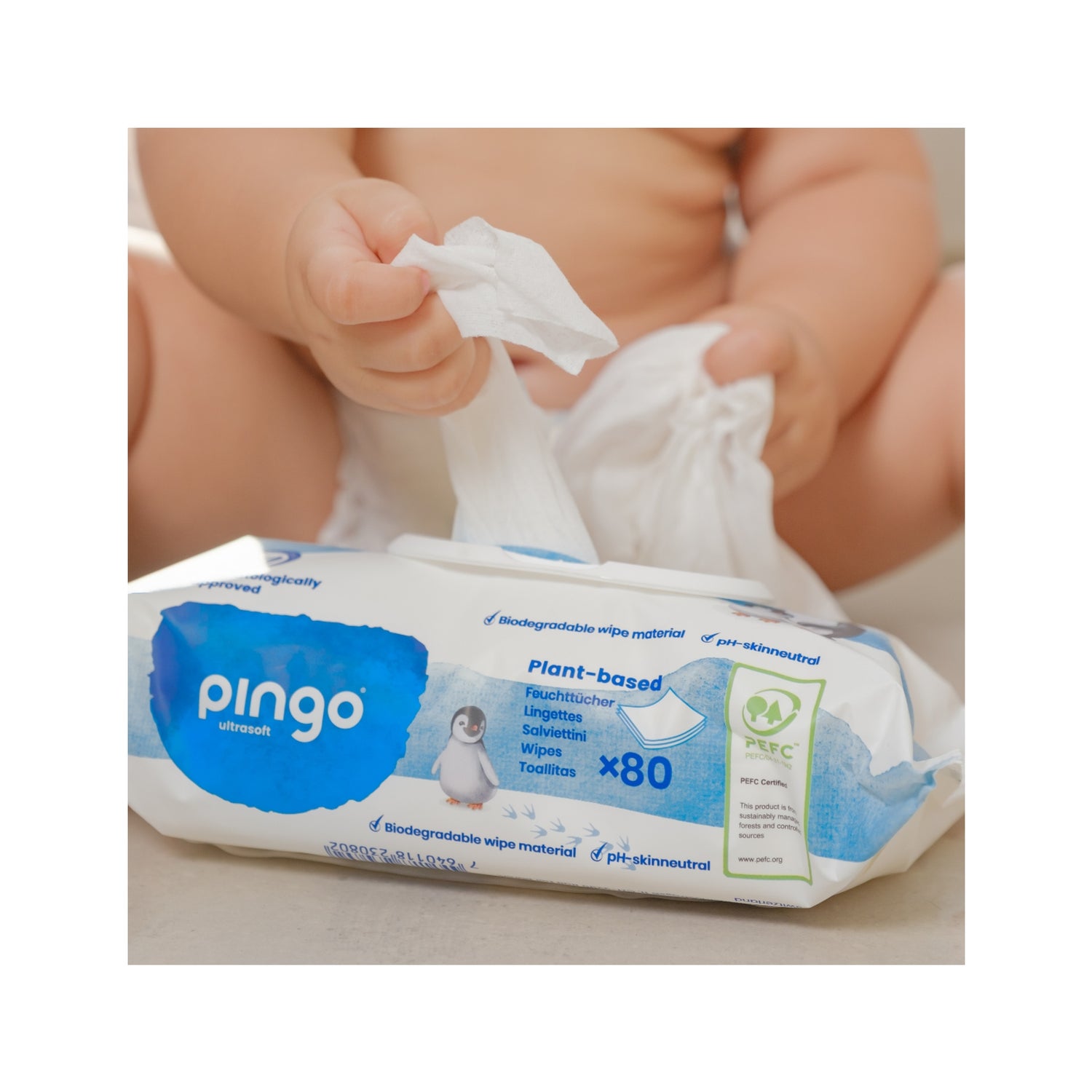 Fabricadas com celulose cultivada organicamente e sem componentes tóxicos, as toalhitas Pingo oferecem uma elevada tolerância para todos os tipos de pele. O tecido resistente e amigo da pele é composto por 50% de celulose, 30% de poliéster e 20% de polipropileno. Além disso, a embalagem dos toalhetes é feita com 40% de materiais reciclados.