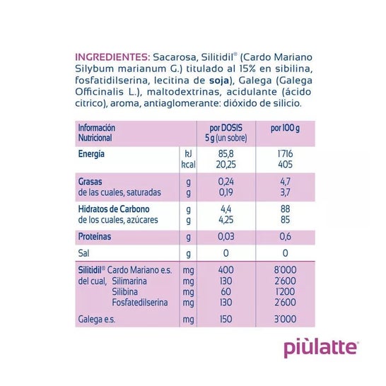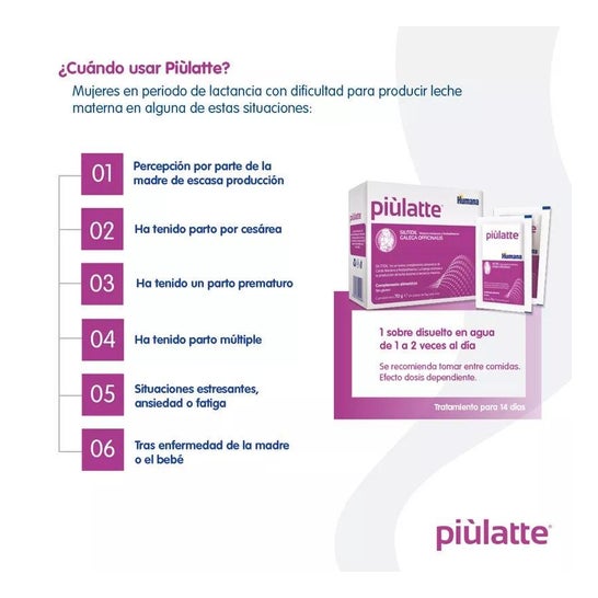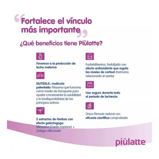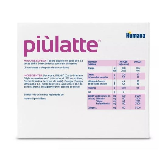 O Humana Piùlatte Silitidil® 14 é um suplemento alimentar que inclui cardo de leite e fosfatidilserina, ingredientes que contribuem para a produção de uma maior quantidade de leite materno durante o período de amamentação. Seus extratos naturais, como cardo de leite e galega, juntamente com o impacto antioxidante dos fosfolipídios que contêm, ajudam a regular os níveis de cortisol. Isto ajuda a melhorar e estimular a produção natural de leite durante a lactação.