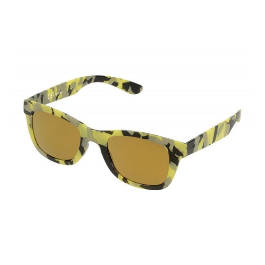 Óculos de sol com armação quadrada em acetato com estampado de camuflagem amarelo e lentes polarizadas com filtros UV de categoria 2. Ajudam a proteger os olhos dos raios solares e a evitar a fadiga ocular. Possui hastes de 140 mm, ponte de 22 mm e lentes de 50 mm. Adequado para adultos.