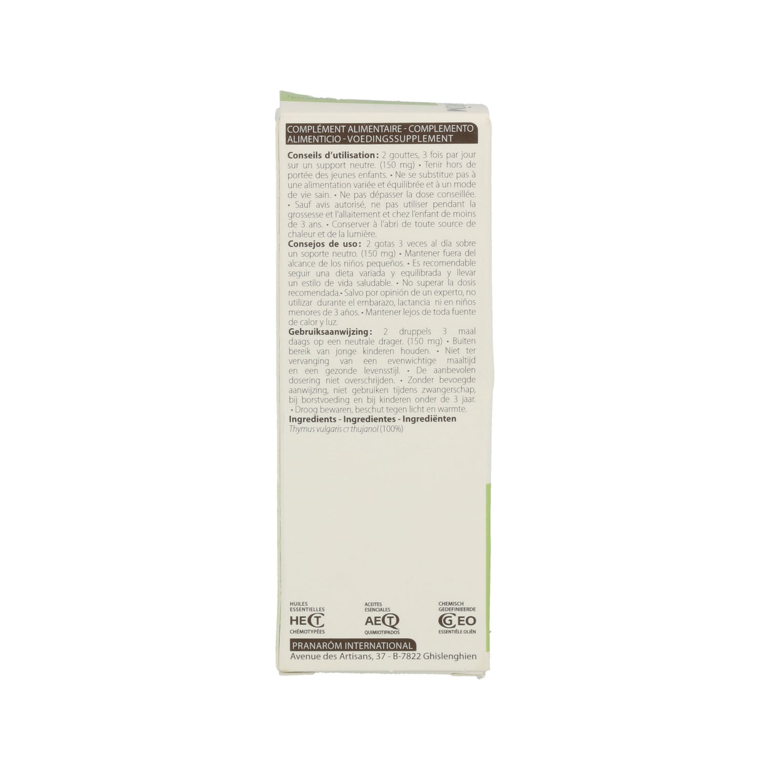 Para uso cutâneo ou oral. Diluir duas gotas do óleo essencial comum de tomilho Qt thuyanol com um suporte neutro, como mel, açúcar de cana ou óleo vegetal.