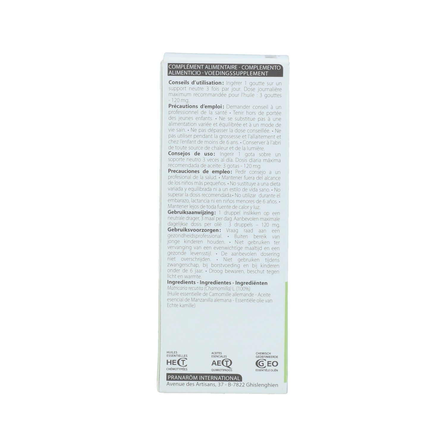 Pranarom Óleo Essencial de Camomila Alemã 5ml é um óleo essencial 100% puro e natural feito de camomila alemã, uma variante azul com propriedades anti-inflamatórias, fungicidas e antibacterianas. Este óleo é conhecido pelas suas propriedades calmantes, e promove a tonificação do sistema digestivo. É também utilizado para aliviar doenças de pele como queimaduras, eczema, bolhas, feridas ou erupções cutâneas.