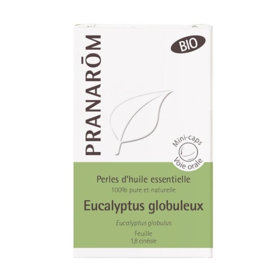 Pérolas orgânicas de óleo essencial de eucalipto (Eucalyptus globulus) em formato de mini cápsula pré-doseada com óleo essencial de Eucalyptus globulus 100% puro e natural. Num formato prático e com um gosto neutro, são fáceis de engolir. Encontrada em muitas partes do mundo (Espanha, Chile, Índia, China, etc.) e amplamente utilizada pelas suas propriedades curativas, esta bela árvore da grande família das myrtacaeas aromáticas tem propriedades antivirais, antifúngicas, antibacterianas e expectorantes, melhorando ao mesmo tempo as defesas do corpo.