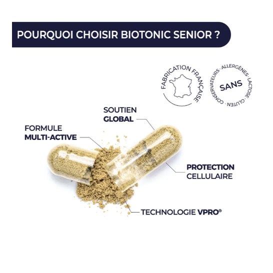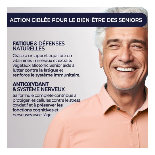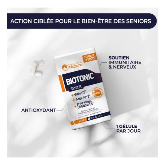 Prescription Nature Biotonic Senior 90caps é um complemento completo que combina vitaminas, minerais, extratos de plantas e probióticos para apoiar a vitalidade diária.