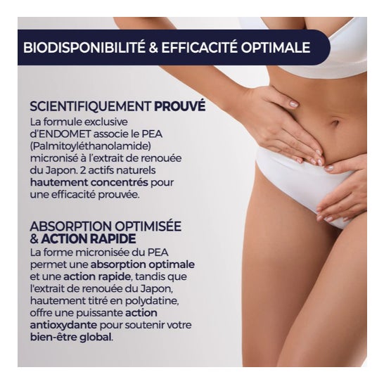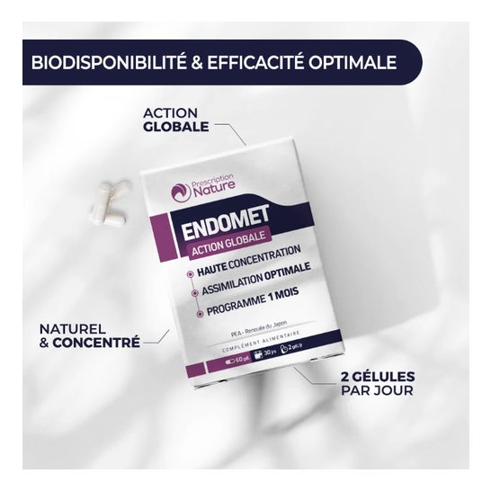 Prescription Nature Endomet Action Globale 60 cápsulas é um complemento alimentar que associa dois ativos altamente concentrados e cientificamente reconhecidos por sua eficácia.