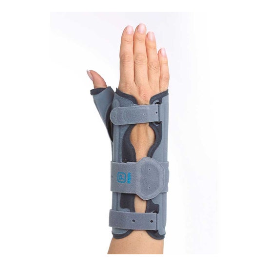 Incorpora uma férula palmar que limita a flexão dorso-palmar. Além disso, inclui:
