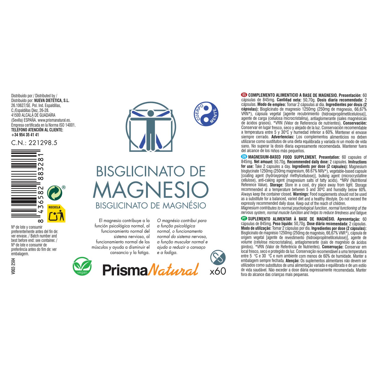 Prisma Natural Bisglicinato de Magnésio é um suplemento em forma de cápsulas que fornece uma fonte de magnésio essencial. Este mineral desempenha um papel chave em mais de 600 reações enzimáticas, sendo especialmente importante para o correto funcionamento do sistema nervoso central.