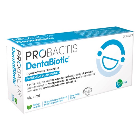 Probactis Dentabiotic Sabor Menta 30 Pastilhas Para Chupar é um probiótico formulado à base de Streptococcus salivarius M18 e vitamina D.