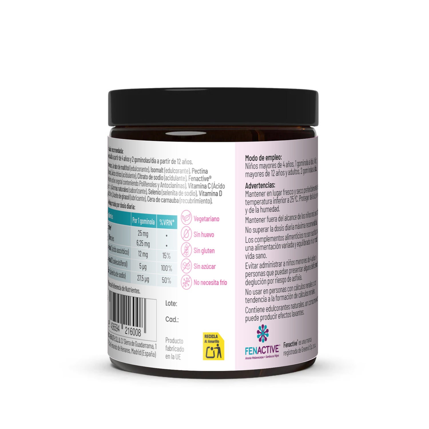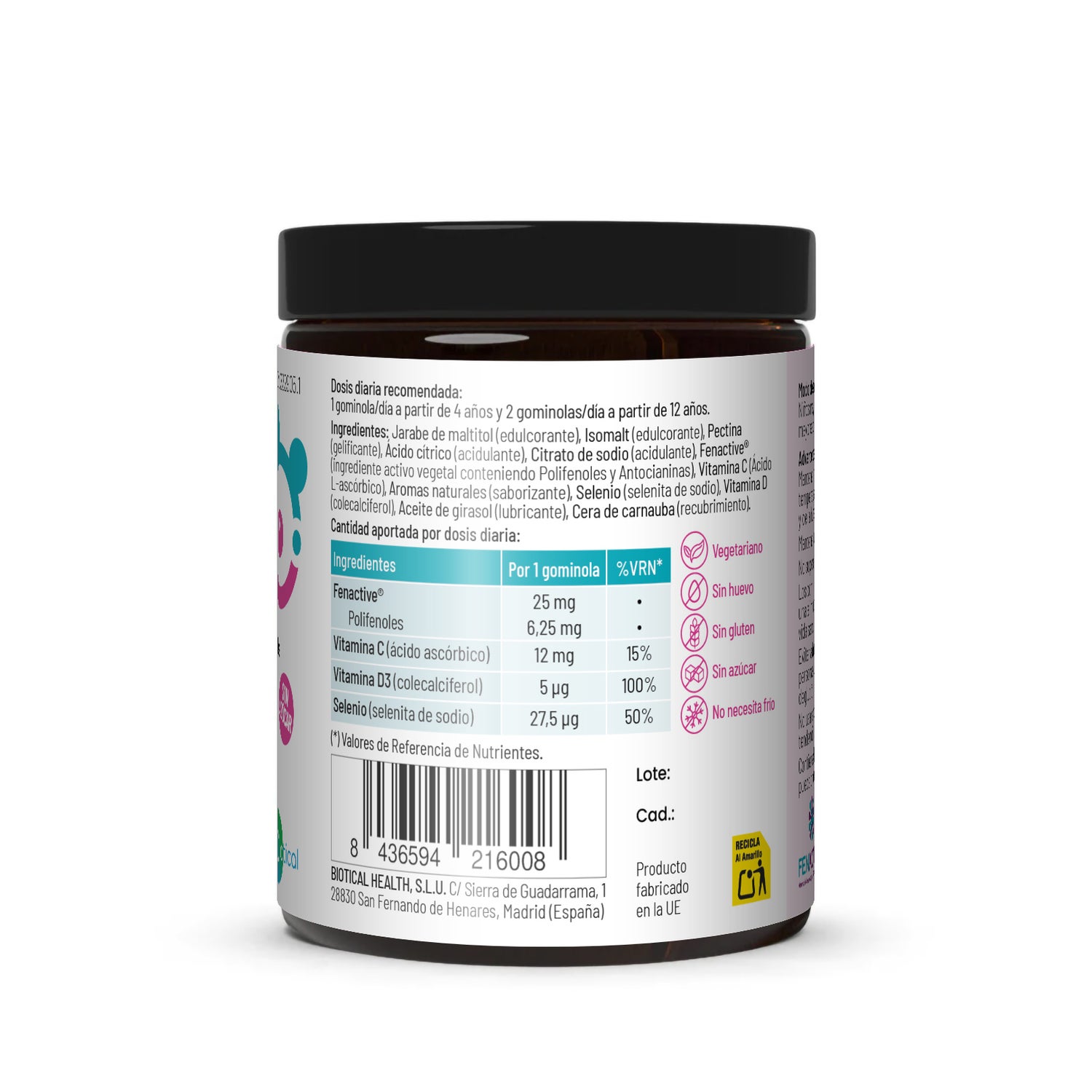 Probactis Gomifenoles® são gomas mastigáveis formuladas com Fenactive®, um complexo patenteado rico em polifenóis naturais extraídos de bagas de sabugueiro e Aronia, vitamina C, vitamina D e selênio, para reforçar o sistema imunológico de crianças e adultos.