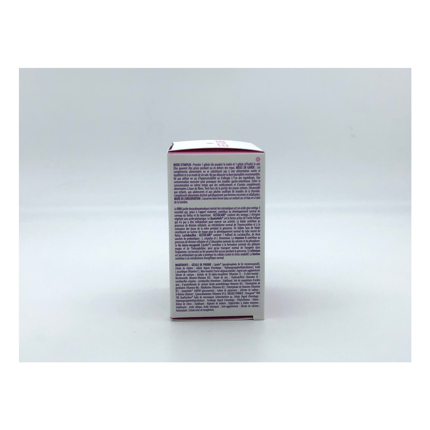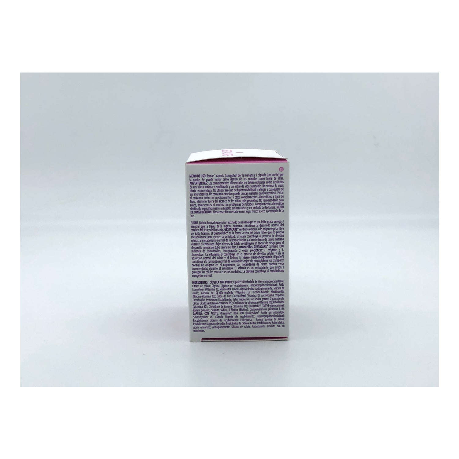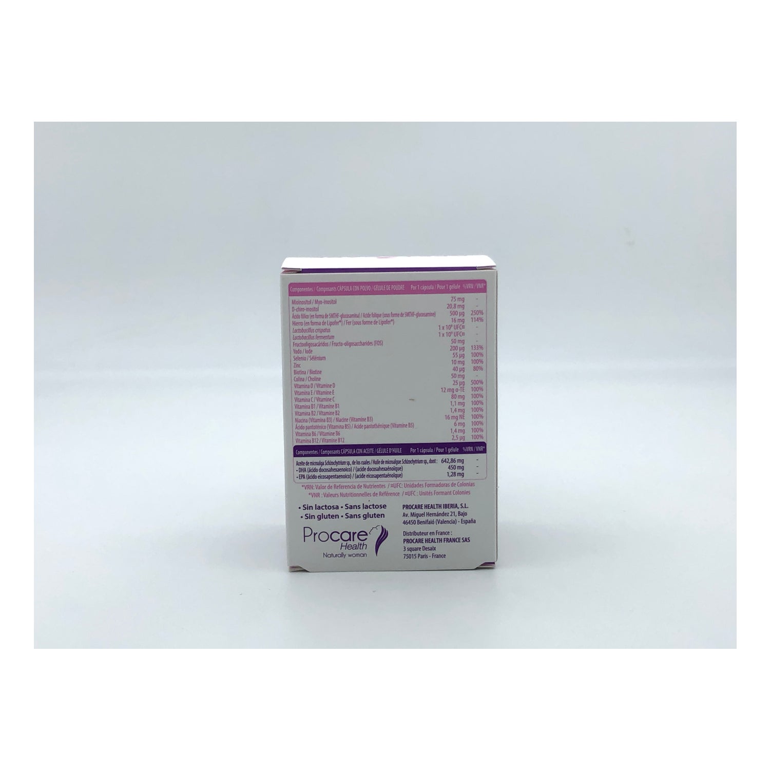 Formulado com ômega 3, mioinositol e D-chiro-inositol, Quatrefolic®, probióticos e prebióticos, vitamina D, ferro microencapsulado e vitaminas e minerais.