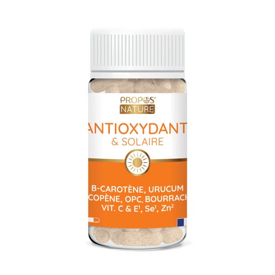 Propos' Nature Antioxidante & Solar 60 Pérolas é um complemento alimentar formulado para potencializar a beleza natural da pele. Este produto contém uma mistura eficaz de nove ativos antioxidantes, entre os quais se encontram: