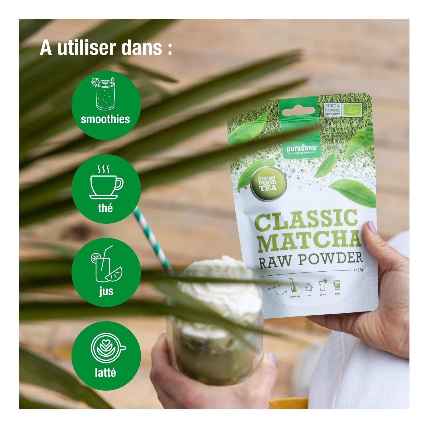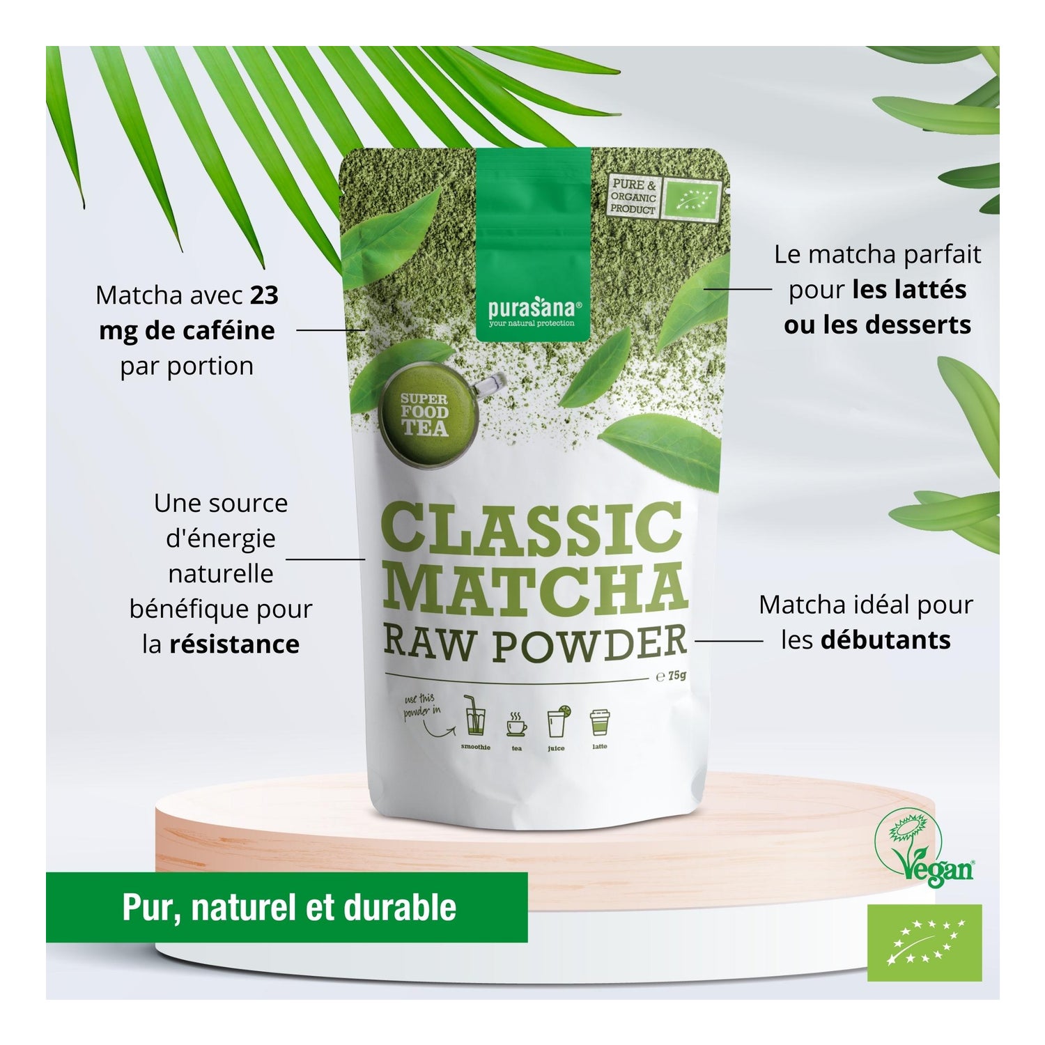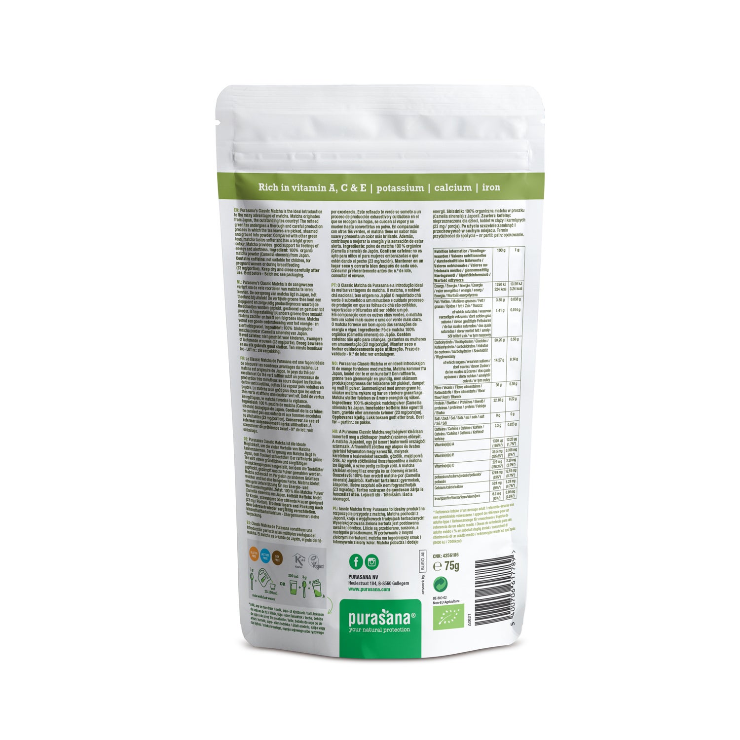 Purasana Matcha Matcha Powder Classic Bio 75g é um pó de chá verde matcha que ajuda a aumentar a sensação de energia.