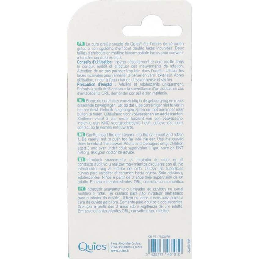 Este limpador de ouvidos suave da Quies permite uma limpeza delicada do canal auditivo, ajudando a prevenir a formação de rolos de cera. Suas duas extremidades curvas e de dupla face são projetadas para: