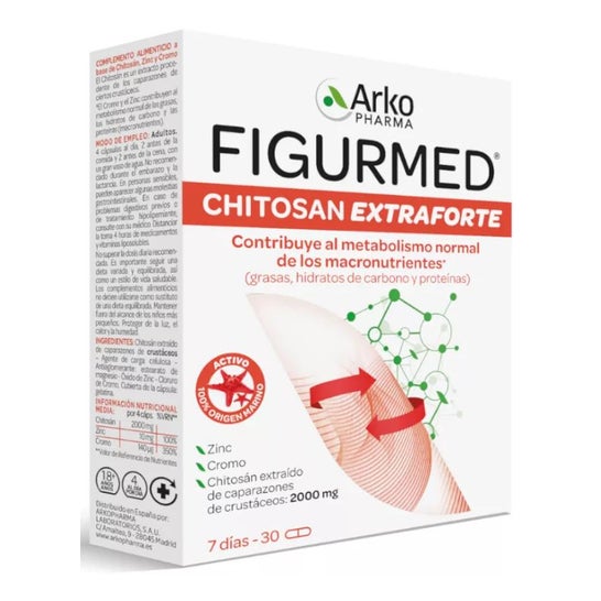 Arkopharma Figurmed Chitosan Extra Forte 30caps é um extrato destinado a combater a absorção das gorduras dos alimentos, uma vez que é derivado de um polímero natural extraído de crustáceos marinhos (quitina). Este é um dos polímeros naturais mais abundantes e é um suplemento alimentar que contém crómio, um mineral envolvido na regulação das gorduras e dos açúcares.
