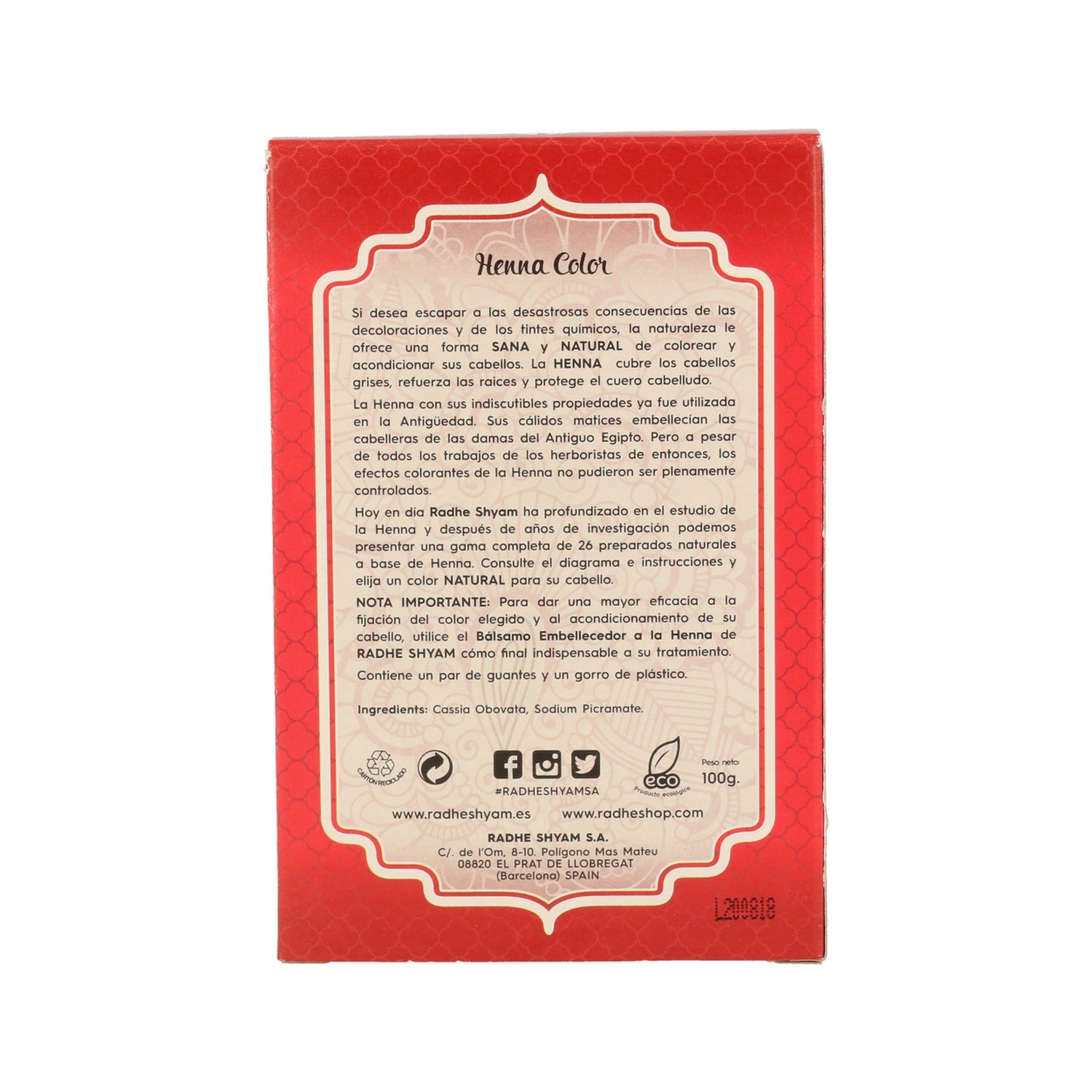 Pó de coloração capilar 100% natural, com certificação biológica, com uma grande reputação no mundo da coloração capilar natural, colore o cabelo sem o danificar. Oferece uma forma saudável e natural de colorir e condicionar o cabelo. A hena cobre os cabelos brancos, fortalece as raízes e protege o couro cabeludo. A hena é o pó de uma planta, Lawsonia Inermis, que contém uma molécula chamada Lawsona. Esta molécula interage com a queratina natural do cabelo.