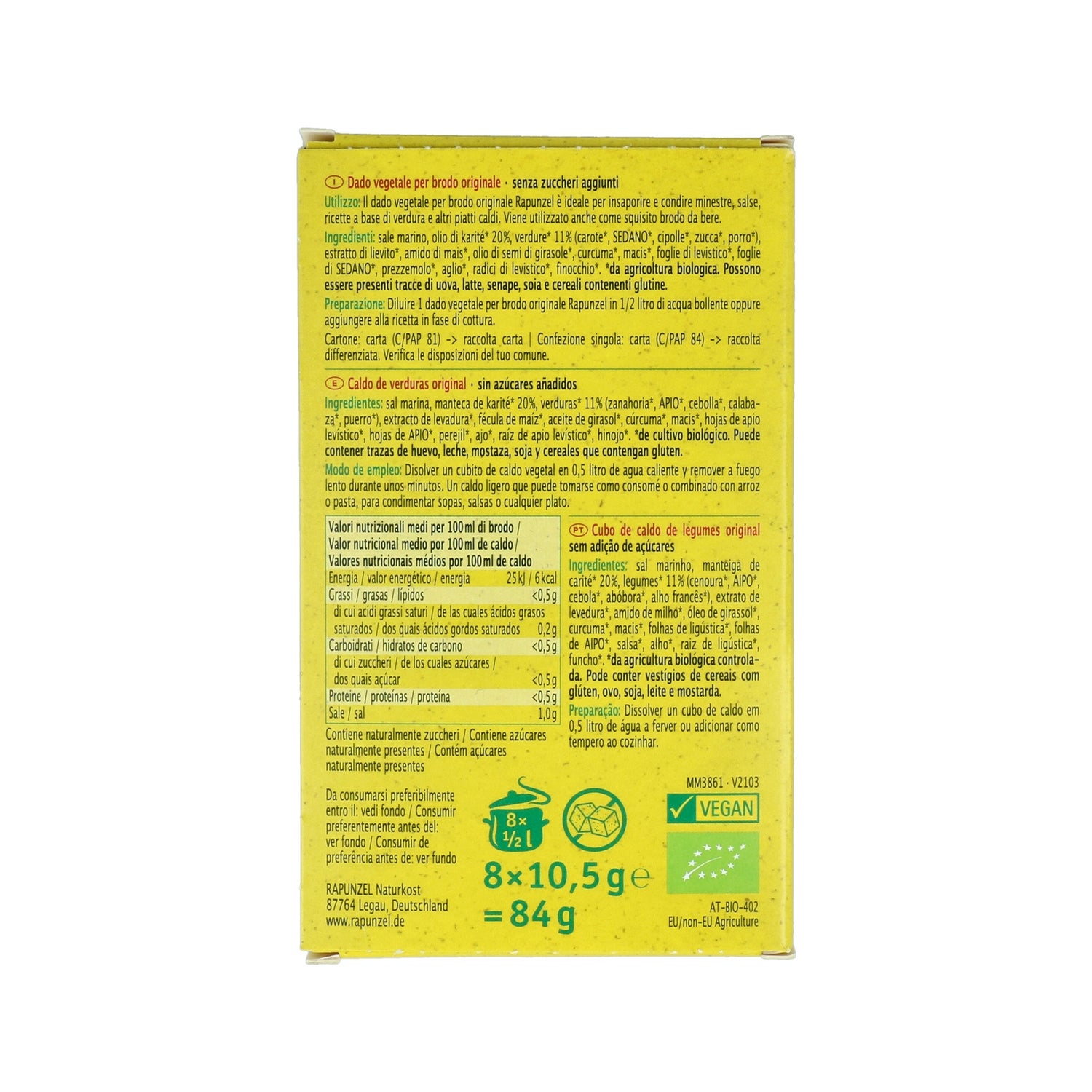 Cubos de caldo de legumes concentrado à base de extractos de legumes provenientes da agricultura biológica. Ajudam a realçar o sabor das preparações e a realçar o tempero dos alimentos. Ideal para adicionar a guisados, arroz e pratos de carne.