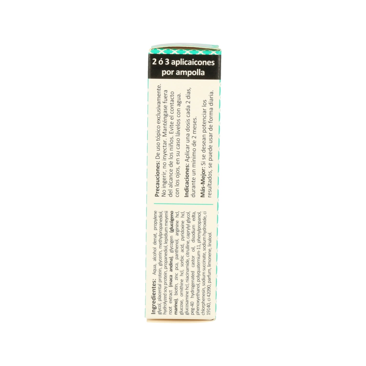 AQUA, ALCOHOL DENAT, PROPYLENE GLYCOL, PLACENTAL PROTEIN, GLYCERIN, METHYLPROPANEDIOL, HYDROLYZED SOY PROTEIN, PROPANEDIOL, LEPIDIUM MEYENII ROOT EXTRACT (MACA ANDINA), GLYCOGEN (GLUCÓGENO MARINO), BIOTIN, ZINC PCA, PANTHENOL, ARGININE HCL, GLUCOSE, ORNITHINE HCL, SORBIC ACID, PYRIDOXINE HCL, GLUCOSAMINE HCL, NIACINAMIDE, CITRULLINE, CAPRYLYL GLYCOL, PEG-40 HYDROGENATED CASTOR OIL, DISODIUM EDTA, PHENOXYETHANOL, POLYQUATERNIUM-11, PHENYLPROPANOL, CHLORPHENESIN, SODIUM SUCCINATE, SODIUM HYDROXIDE, CI 19140, CI 42090, PARFUM, LIMONENE, LINALOOL