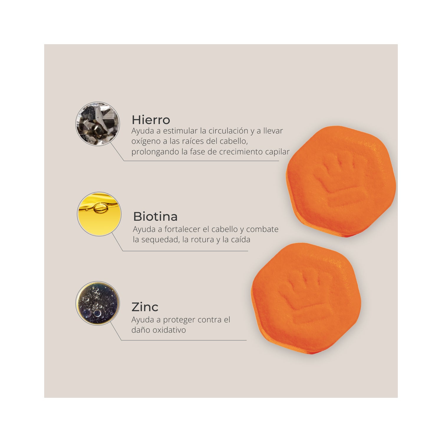 Os seus principais ingredientes incluem queratina, que fornece força e vitalidade, bem como biotina, ferro e zinco, que ajudam a proteger as células dos danos oxidativos e são elementos essenciais para a saúde do folículo capilar.