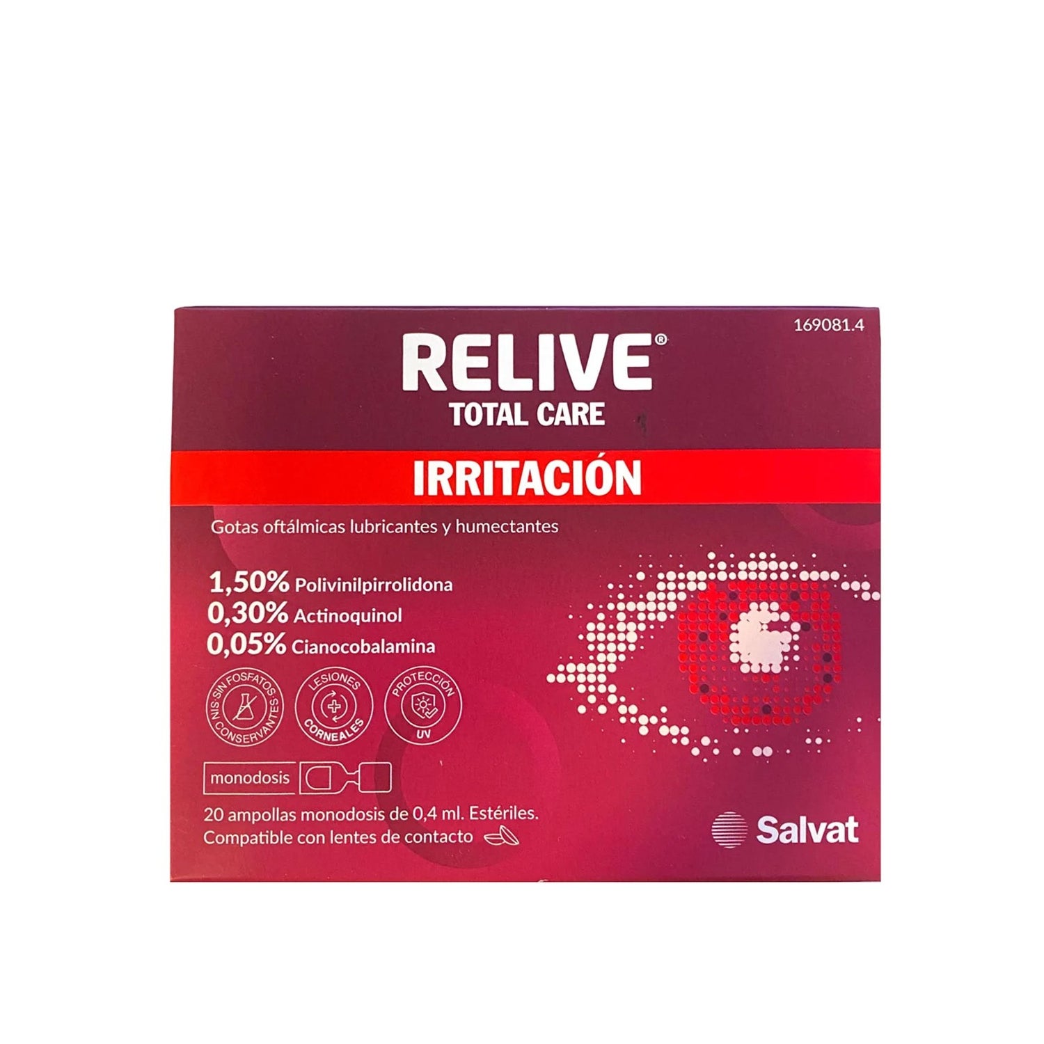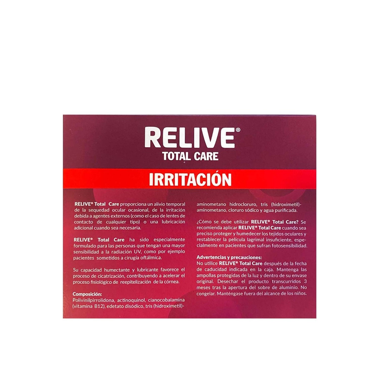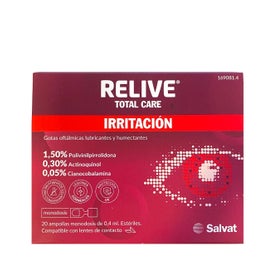 Revive Total Care Eye Drops 20 gotas de dose única são uma gota oftálmica conveniente, lubrificante e hidratante para a recuperação após a cirurgia ocular. Graças à sua intensa acção lubrificante, favorecem a redução da secura ocasional do olho e da irritação provocada por agentes externos. Este líquido estéril contém polivinilpirrolidona, um composto que aumenta o tempo de retenção de água na superfície dos olhos e acalma qualquer desconforto ou prurido. Apresenta uma cor avermelhada devido à presença de cianocobalamina, sem a necessidade de manchar as lentes ou pigmentar as suas lágrimas.