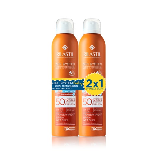 Rilastil Sun System Baby Spray Solar Corporal Transparente SPF50+ 2x200ml é um pack composto por dois protetores solares de fator alto para proteger a pele do sol durante todo o verão.
