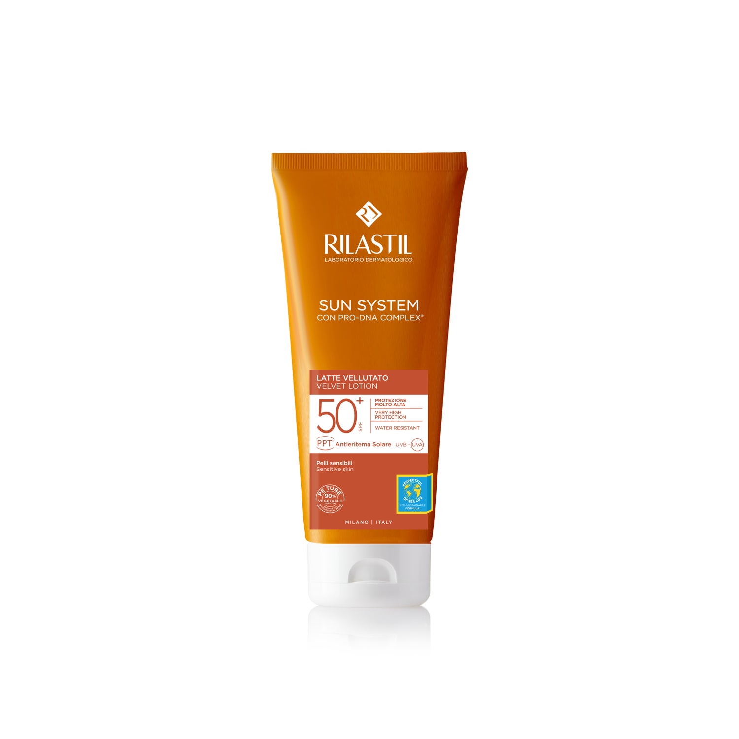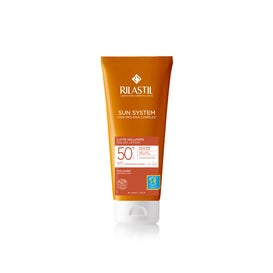Rilastil Sun System Latte SPF50 100ml é um leite solar corporal para todos os tipos de pele. Protecção solar corporal muito elevada para toda a família. Protege eficazmente da radiação solar e dos danos celulares causados pela radiação UVA e proporciona uma acção antioxidante. Formulado com Vitamina E, extrato de chá verde, aloe vera e bisabololol. Hipoalergénico. Sem corantes e sem fragrâncias.