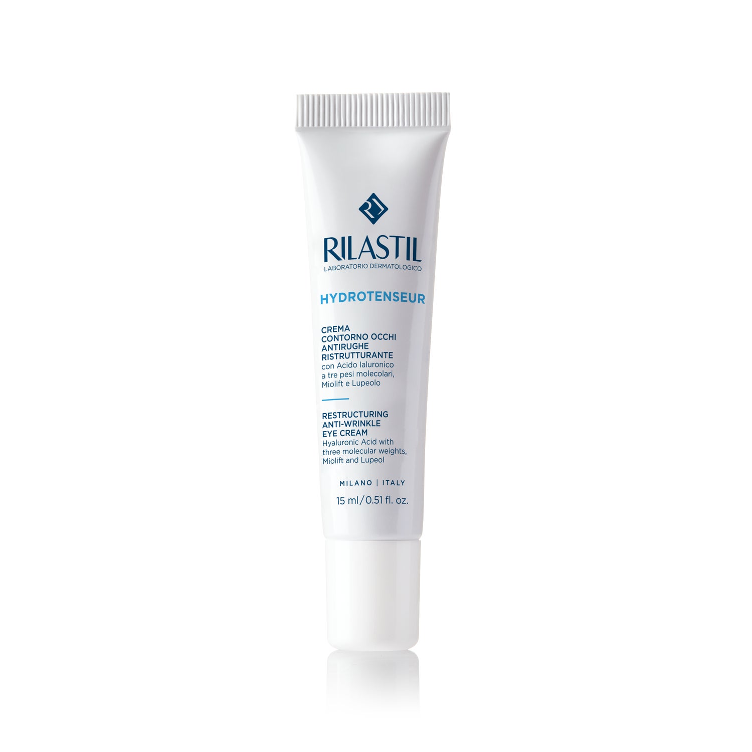 Rilastil Hydrotenseur Reestruturador e Anti-Rugas Contorno dos Olhos 15ml é um creme de textura ligeira concebido para cuidar da pele sensível à volta dos olhos.