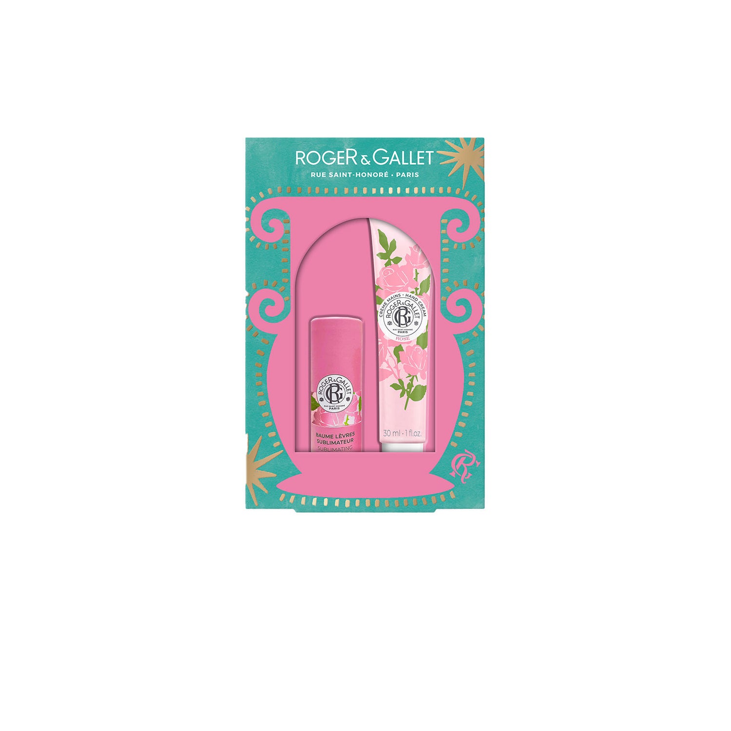 Roger & Gallet Rosa Pack Bálsamo Labial + Creme para Mãos inclui um bálsamo labial e um creme para mãos para hidratar e embelezar lábios e mãos secas, com a suavidade da rosa Damascena. Fabricado na França, conta com fórmulas veganas e testadas dermatologicamente.