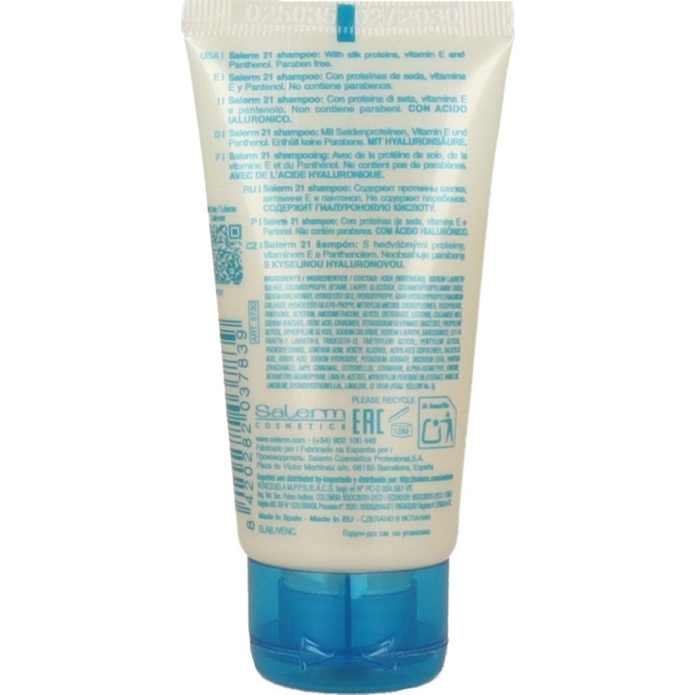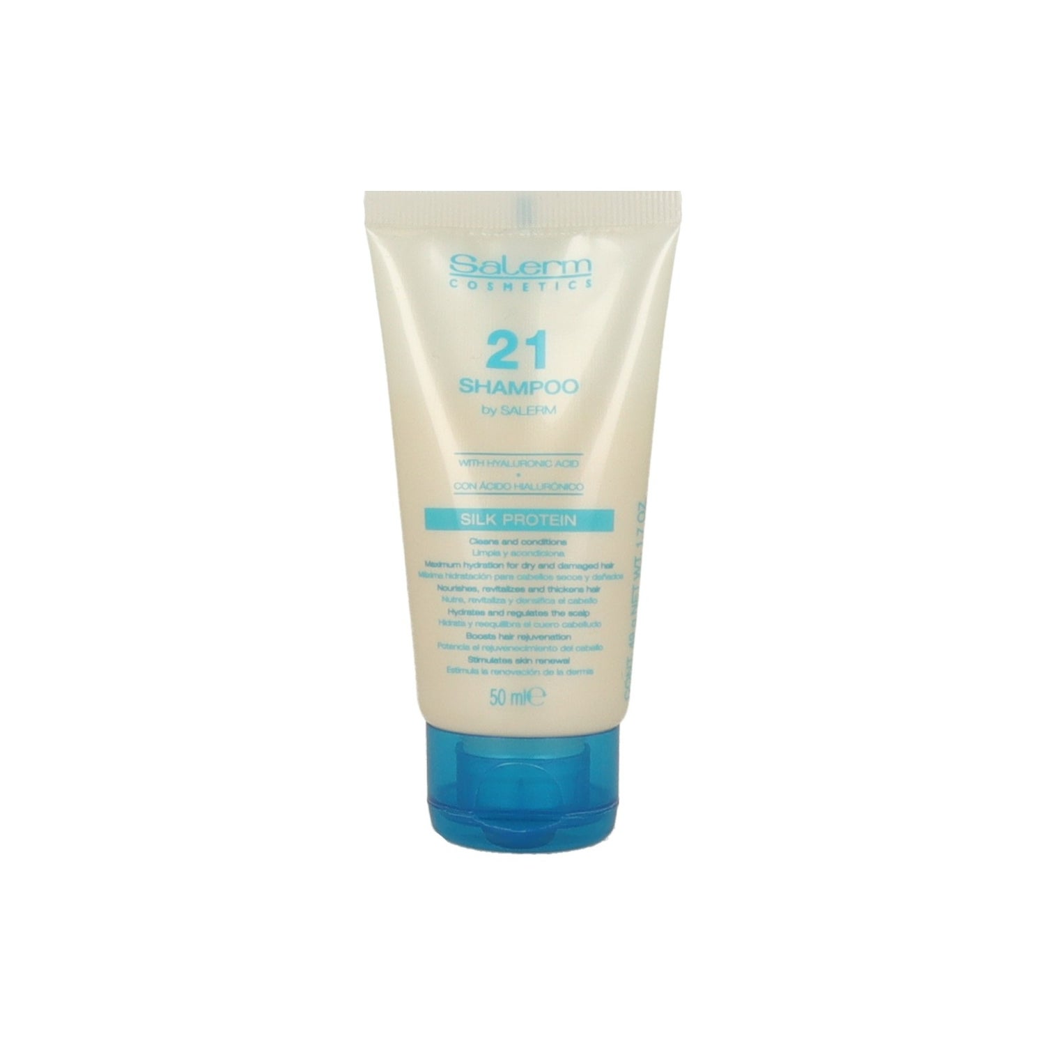 Salerm 21 Champô Proteína de Seda 50 ml para cabelos secos e danificados é um champô condicionador que limpa suavemente e ajuda a reparar em profundidade. Sua fórmula com proteínas de seda atua sobre a fibra capilar e proporciona hidratação e nutrição desde a primeira aplicação.