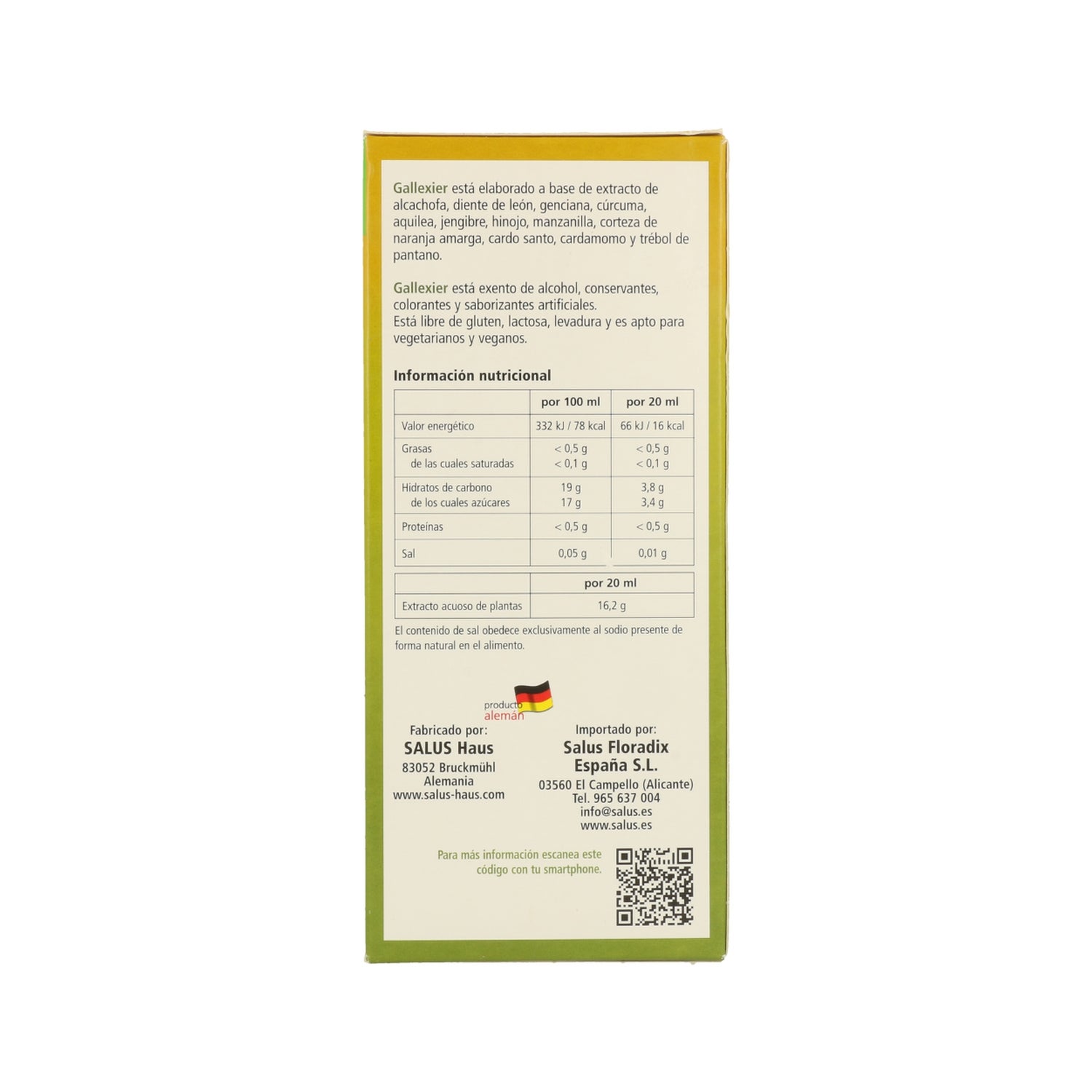 Gallexier® Salus Floradix é umxarope que ajuda a promover a digestão do corpo. Feito a partir de extracto de alcachofra, dente de leão, genciana, açafrão, açafrão-da-terra, gengibre, funcho, camomila, casca de laranja, cardo sagrado, cardamomo e trevo de pântano combatem as digestões pesadas.