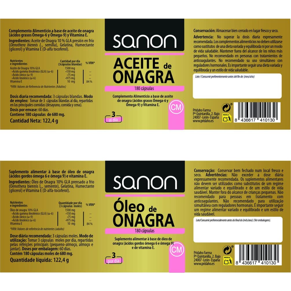 Sanon Óleo de Onagra 180caps é um suplemento alimentar que contém óleo de onagra de qualidade, obtido a partir da semente de Oenothera biennis L.. Este óleo se destaca pelo seu conteúdo de ácido gama-linolênico (GLA), que está presente em 10%.