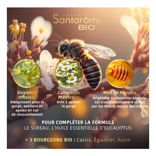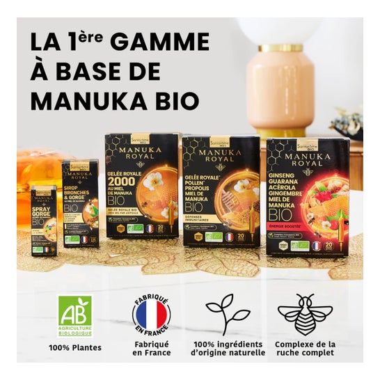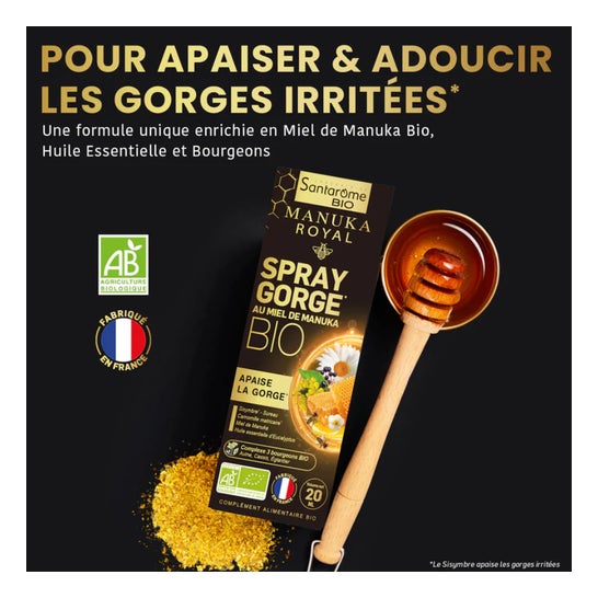 Santarome Spray Garganta Manuka Royal Bio 20ml associa os benefícios da fitoterapia, da colmeia, da aromaterapia e da gemoterapia para acalmar as gargantas irritadas e favorecer o conforto respiratório.
