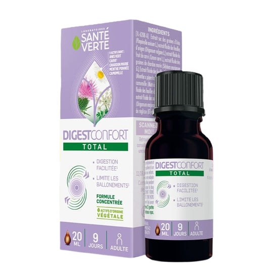Santé Verte DigestConfort Total 20ml é um complemento alimentar à base de uma mistura de plantas destinadas a favorecer o bem-estar digestivo. Contém um complexo de nove plantas específicas, entre elas o cominho, reconhecido tradicionalmente por favorecer a digestão, ajudar a aliviar desconfortos digestivos como a inchaço e favorecer o bom trânsito intestinal. Apenas para adultos. Os complementos alimentares devem ser utilizados como parte de uma dieta variada e equilibrada e um estilo de vida saudável.