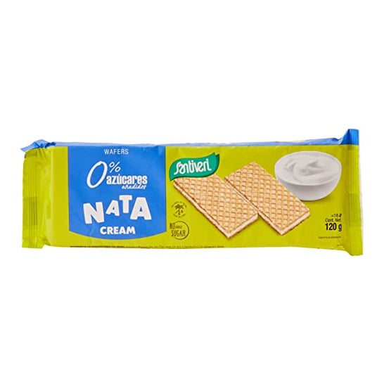 Wafers sabor nata 0% açúcares adicionados 120 g Santiveri: Delicadas e leves bolachas tipo wafer recheadas com creme sabor nata. Sem açúcares adicionados nem gordura de palma.