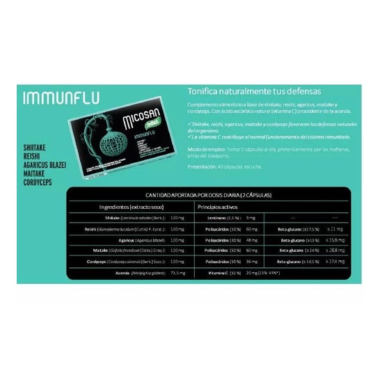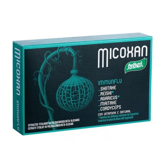 Santiveri Micosan Immunflu 40caps é um suplemento alimentar que contribui para o fortalecimento do sistema de defesas do organismo. Este produto combina cogumelos utilizados na medicina tradicional chinesa, conhecidos por serem ricos em nutrientes, incluindo beta-glucanos, que podem ter um impacto positivo nas células de defesa.