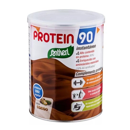 SantiveriProtein 90 Instan Cacau 200g é um complemento alimentar com um elevado teor proteico de 90%, e um agradável sabor a cacau. Esta proteína é de origem vegetal e está enriquecida com aminoácidos essenciais, incluindo 18% de aminoácidos de cadeia ramificada. Ajuda a promover o aumento e a manutenção da massa muscular, sendo ideal tanto para desportistas como para aqueles que necessitam de uma maior ingestão de proteínas na sua alimentação. Recomenda-se ter em conta que contém sulfitos, os quais se encontram naturalmente nos isolados de proteína de soja.